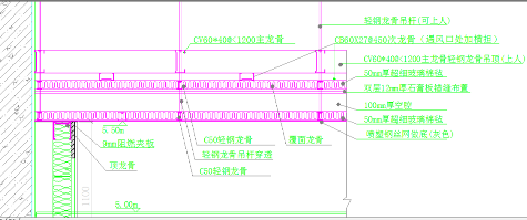 從圖1可以看到,為了防止墻面微小孔隙對(duì)隔聲量的影響,通常會(huì)在原墻體外增加20mm后的水泥砂漿扇灰,然后留100mm的空腔以增加對(duì)聲音低頻部分的吸收。通過把玻璃絲棉固定在橫撐龍骨上,來控制混響時(shí)間的高頻部分。圖2為演播室房頂?shù)穆晫W(xué)結(jié)構(gòu)大樣圖,它分為隔聲層及吸音層兩層,上層通過輕鋼龍骨及次龍骨把隔聲層固定。隔聲層是由超細(xì)玻璃棉及錯(cuò)縫拼接的雙層石膏板構(gòu)成,以隔絕天花以上及空調(diào)的噪聲。它的下層100mm位置,通過噴塑鋼絲網(wǎng)固定50mm厚的玻璃絲棉起到對(duì)混響時(shí)間控制的作用。由于通常對(duì)演播室防火安全要求為A級(jí),故選用玻璃吸聲棉以及難燃的玻璃纖維布,作為主要的吸聲材料。