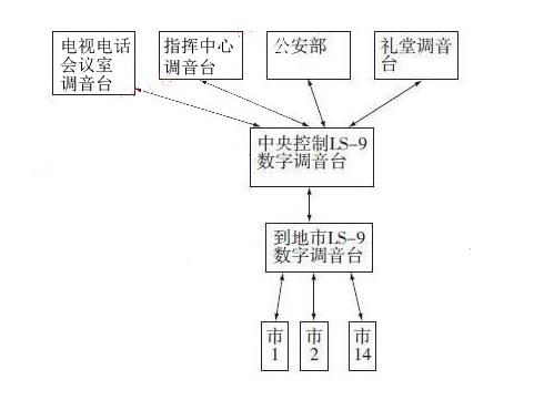 首先在信號(hào)匯集點(diǎn)圖像控制中心放置兩臺(tái)LS-9,其中一臺(tái)用來(lái)匯集各個(gè)會(huì)場(chǎng)以及公安部的音頻信號(hào),另一臺(tái)用來(lái)接收和發(fā)送各市的音頻信號(hào);其他每個(gè)會(huì)場(chǎng)放置一臺(tái)普通的調(diào)音臺(tái)即可,用于與中心交換音頻信號(hào),如圖1所示。