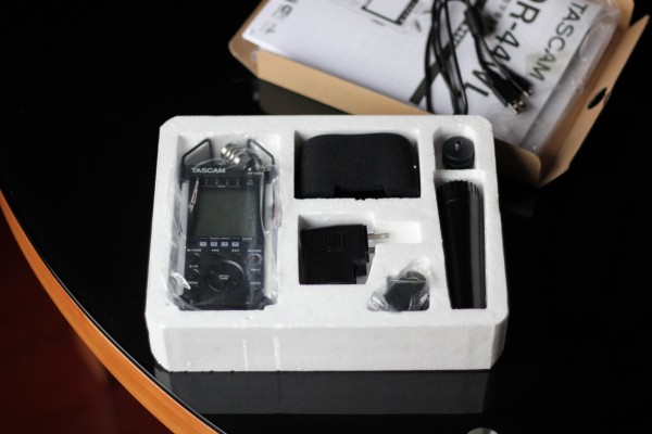 圖三:內(nèi)盒是硬質(zhì)泡沫與硬質(zhì)紙皮夾層。里面包含錄音機本體、海綿防噴罩、電源適配器(包含偏頭和圓頭兩種規(guī)格的接頭)、手持配件以及熱靴轉(zhuǎn)接頭(用于相機連接)。