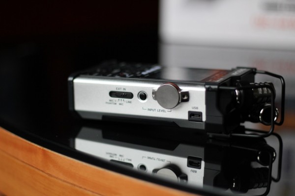 圖十:機身右側(cè)分配的是輸入電平功能區(qū),包含輸入電平界面開關以及大旋鈕。下方是外置輸入方式選擇,包括線性輸入(Line)、話筒輸入(MIC)以及幻象電源(在設置中可以選擇48v和24v)開關話筒輸入(MIC+PHANTOM),個人覺得比較可惜的一點是,這額外輸入口只有一個開關控制,也就是說不能分別為這兩個通道選擇輸入的類型,幻象電源也只能同時打開(需要注意某些老話筒不能接到幻象電源上)。USB接口用于連接電腦和外置電源。