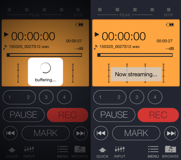 圖二十一:使用Streaming功能在手機上試聽DR-44WL上錄制的音頻,需要幾秒鐘的緩沖,然后播放的時候會顯示正在Streaming。不過目前這個功能還有一個bug,在進行緩沖的時候,DR-44WL已經(jīng)開始播放了,造成播放時APP與DR-44WL上的走帶時間不同步,應該會在今后的更新中修復。