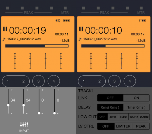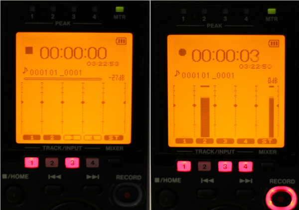 在4ch模式下通道1234固定對應的是內(nèi)置話筒左/右以及外置輸入左/右。在準備錄音狀態(tài)下,同時按下12/34可以拆分或組合立體聲道(不能組合內(nèi)置與外接通道)。