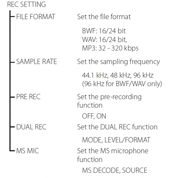 不僅如此,DR-44支持“雙重錄音”,雙重錄音的意思是可以同時錄制“不同格式”或者“不同電平”的兩組錄音。在REC Setting中可以看到DUAL REC的設定。