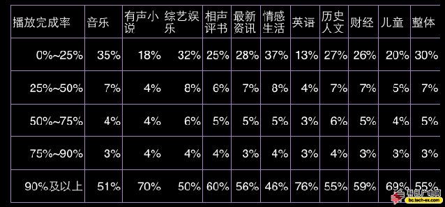 網(wǎng)絡(luò)電臺(tái)上,在收聽不到25%內(nèi)容時(shí)就跳出的概率非常大。這就意味著,與其它媒介形式類似(比如文字、視頻),網(wǎng)絡(luò)用戶并不太具有耐心。而如果一旦跨過這個(gè)檻,他們的耐心都不錯(cuò)。從類別上說(shuō),完播率最高的是英語(yǔ)類別,但考慮到英語(yǔ)類別受歡迎的本來(lái)就以5分鐘以下的碎片為主,這個(gè)完播率并不讓人驚艷。排在第二的是有聲小說(shuō),無(wú)論是完播率還是節(jié)目時(shí)長(zhǎng),都說(shuō)明這類節(jié)目很受歡迎。而這一點(diǎn),喜馬拉雅和蜻蜓差不多。