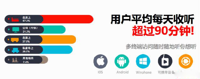 隨著智能手機(jī)普及,移動(dòng)互聯(lián)網(wǎng)大潮來(lái)襲,網(wǎng)絡(luò)音頻迅速得到了成長(zhǎng)。短短幾年,兩家都累積了億當(dāng)量級(jí)的用戶,算是風(fēng)口上的一只小豬。