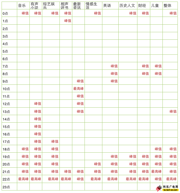 蜻蜓CEO楊廷皓說(shuō),網(wǎng)絡(luò)音頻目前用戶主要集中收聽有聲書、新聞資訊、情感生活類等類別。就蜻蜓而言,高峰時(shí)間段是兩個(gè)。其一,早上7-8點(diǎn),這也是全天同時(shí)在線用戶量的頂峰,以新聞資訊為主。其二,晚上9點(diǎn)到深夜1點(diǎn),以有聲小說(shuō)、情感夜話為主。