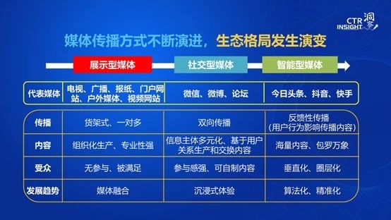 這種類型是以頭條系、抖音和快手為代表的短視頻平臺。其典型的特點是反饋式傳播,根據(jù)受眾的畫像、受眾以往的行為特點形成算法,精準推送。這種媒體就可以做到千人千面,這是跟以往媒體不一樣的。