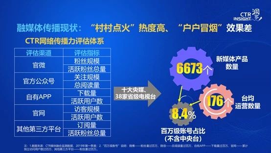 2018年,CTR對38家電視臺、十大央媒的融媒體傳播力進行了盤點,形成了CTR網(wǎng)絡(luò)傳播力評估體系。在針對五大渠道的評估體系當中,我們把主要央媒和電視臺的新媒體產(chǎn)品進行了梳理,發(fā)現(xiàn)賬號數(shù)量達到6000~8000個,數(shù)量非常巨大,臺均運營數(shù)量176個。