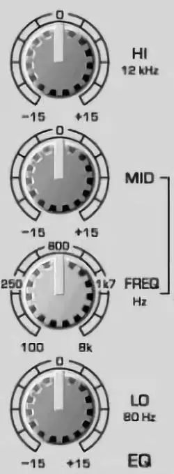 高頻段和低頻段的極限頻率為12千赫茲和80 赫茲。對(duì)中頻范圍調(diào)音臺(tái)有一個(gè)半?yún)?shù)型音質(zhì)調(diào)節(jié),適用于100赫茲至8千赫茲之間。用MID調(diào)節(jié)按鈕提高/下降音量,用FREQ調(diào)節(jié)按鈕調(diào)節(jié)頻率。