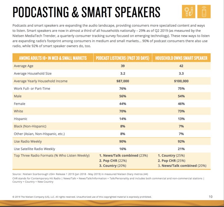 雖然在某些圈子里,農(nóng)村地區(qū)在采用新技術(shù)方面的速度較慢,但尼爾森表示,這些市場內(nèi)的消費(fèi)者是“老練的音頻用戶”,他們還在日常生活中加入了播客和智能音箱。當(dāng)你考慮到新聞/熱心廣播節(jié)目是第二受歡迎的廣播格式時(shí)(在中小市場占11.8%),這些消費(fèi)者對播客的喜愛也是情理之中的。然而,這些聽眾并沒有放棄廣播。