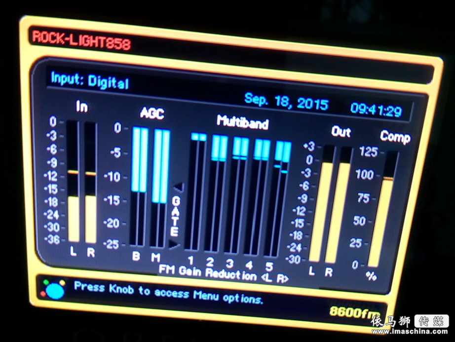 1.該設(shè)備用戶界面友好,參數(shù)設(shè)置、調(diào)整方便。具有模擬和數(shù)字兩種信號(hào)輸入輸出,內(nèi)有八個(gè)工廠預(yù)置:①Classical-Protect產(chǎn)生很清晰的,開闊的聲音。②2B General Purpose提供一個(gè)平均的處理。③Talk談話類節(jié)目處理模式。對(duì)于新聞,熱線電話互動(dòng)節(jié)目,采訪類節(jié)目以及其他語言類節(jié)目。Talk保持播音員和嘉賓的的聲音響度一致。并且在語言和廣告節(jié)目之間保持一個(gè)適當(dāng)?shù)钠胶狻"躆usic-Light產(chǎn)生一個(gè)很開闊的、未經(jīng)壓縮(修飾)的聲音。⑤Music-Medium提供了介于Music-Light和Music-Heavy之間的處理系統(tǒng)。⑥Music-Heavy提供了強(qiáng)烈的刺耳的聲音處理。⑦M(jìn)usic-Bass Medium產(chǎn)生一個(gè)很有動(dòng)感,清晰,開闊的聲音。⑧Music-Bass Heavy提供強(qiáng)烈?guī)в懈郊拥鸵魟?dòng)感的處理。預(yù)加重50µs的預(yù)置[2]:按System setup鍵,顯示屏上顯示的Stereo Encoder下面所對(duì)應(yīng)的按鈕按下,再將顯示屏上顯示的Proc Pre-e下面所對(duì)應(yīng)的按鈕按下,顯示屏上會(huì)出現(xiàn)預(yù)加重時(shí)間常數(shù)50µs、75µs,此時(shí)就可以利用飛梭旋鈕選擇50µs預(yù)加重時(shí)間常數(shù)。