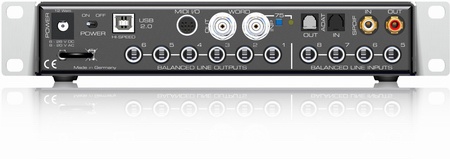 正面的1,2路輸入沒有區(qū)別,都是多用的,既可以插話筒的卡農(nóng)接頭也可以插大三芯作為線路輸入。3,4路輸入既可以插普通大三芯也可以插電吉他電貝司等樂器??瓷先ニ坪鯖]什么特別的,但是重點在于兩個MIC輸入,UCX采用了同UFX相同的話放單元,該單元使用了RME Micstasy的核心技術(shù)(并行轉(zhuǎn)換技術(shù)——每個話放單元采用兩個模數(shù)轉(zhuǎn)換器進行并行模數(shù)轉(zhuǎn)換,由此可獲得更佳的信噪比及寬動態(tài)),能夠進行65dB的數(shù)字增益控制(1dB為最小調(diào)整單位,較大調(diào)整范圍55dB)。這給UCX帶來了更好的音質(zhì)。