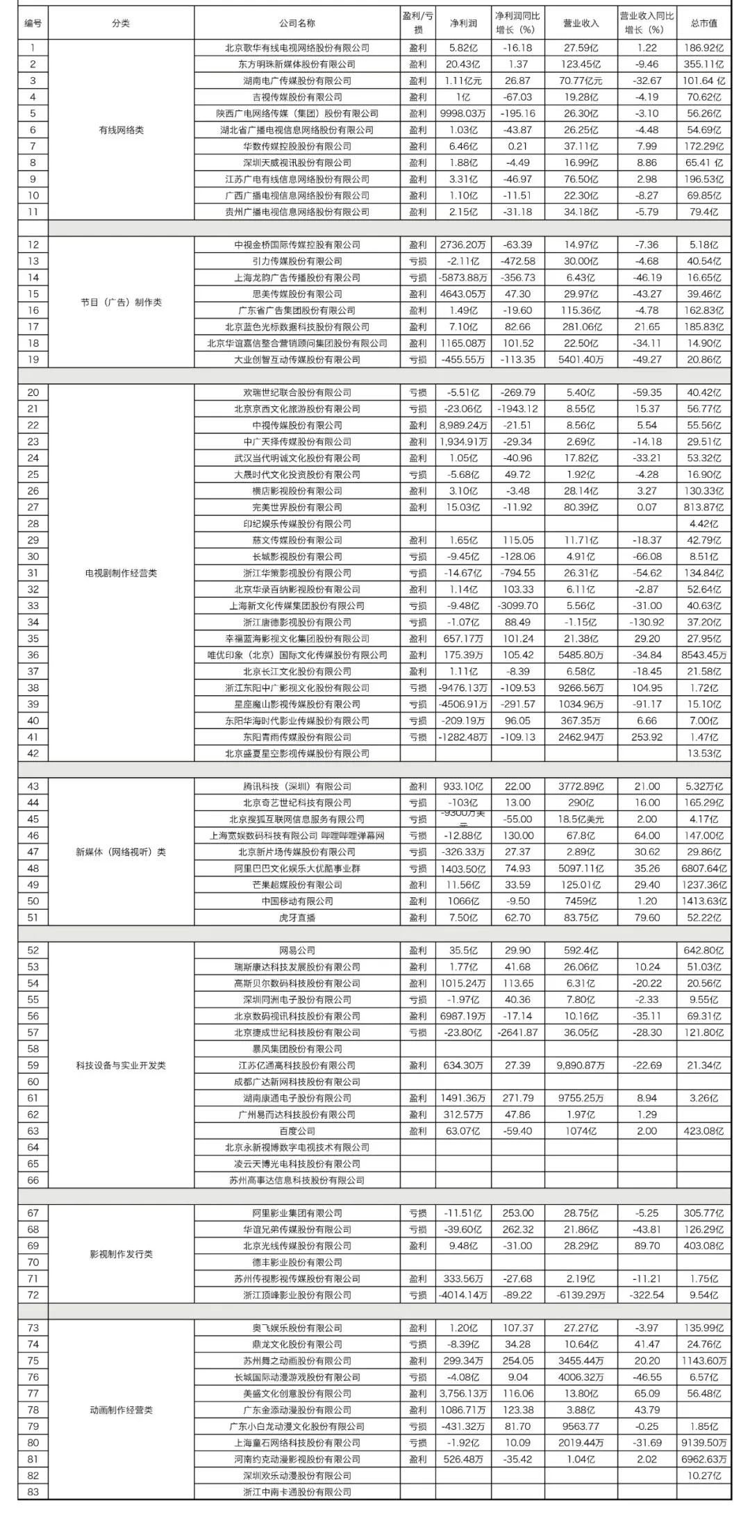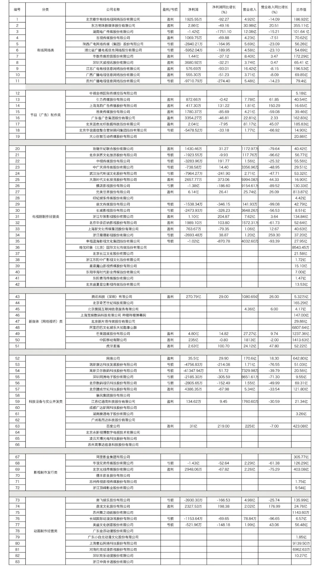 需要說明的是,有6家公司已公告停牌,因而沒有相關(guān)數(shù)據(jù)。這6家公司是:印紀(jì)娛樂傳媒股份有限公司(002143 中小板)、北京盛夏星空影視傳媒股份有限公司(8367016 新三板)、北京永新視博數(shù)字電視技術(shù)有限公司(STV)、凌云天博光電科技股份有限公司(839320 新三板)、蘇州高事達(dá)信息科技股份有限公司(839179 新三板)、浙江中南卡通股份有限公司(833156 新三板)。此外,還有4家公司未按期披露信息,因而也沒有相關(guān)數(shù)據(jù)。這4家公司是:暴風(fēng)集團(tuán)股份有限公司(300431 創(chuàng)業(yè)板)、德豐影業(yè)股份有限公司(839797 新三板)、成都廣達(dá)新網(wǎng)科技股份有限公司(831839 新三板)、深圳歡樂動(dòng)漫股份有限公司(835622 新三板)。