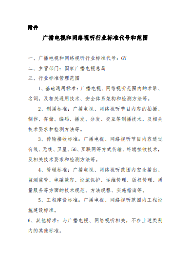 廣播電視和網(wǎng)絡(luò)視聽行業(yè)標(biāo)準(zhǔn)代號(hào)和范圍的調(diào)整正式獲得國(guó)家標(biāo)準(zhǔn)化管理委員會(huì)批復(fù)。行業(yè)標(biāo)準(zhǔn)的名稱調(diào)整為“廣播電視和網(wǎng)絡(luò)視聽行業(yè)標(biāo)準(zhǔn)”,行業(yè)標(biāo)準(zhǔn)代號(hào)保持不變,繼續(xù)沿用“GY”。行業(yè)標(biāo)準(zhǔn)管理范圍重新審定為:基礎(chǔ)通用標(biāo)準(zhǔn)、制播標(biāo)準(zhǔn)、傳輸接收標(biāo)準(zhǔn)、管理標(biāo)準(zhǔn)、工程建設(shè)標(biāo)準(zhǔn)和其他標(biāo)準(zhǔn)。