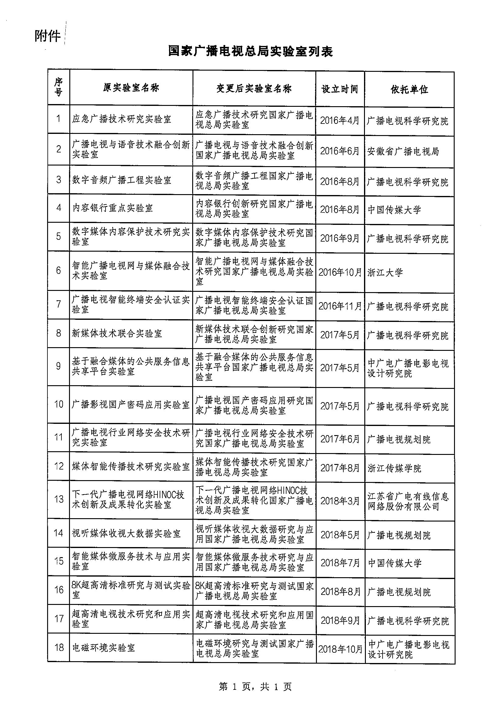 根據(jù)《國(guó)家廣播電視總局關(guān)于印發(fā)〈國(guó)家廣播電視總局實(shí)驗(yàn)室管理辦法〉的通知》(廣電發(fā)〔2021〕4號(hào))有關(guān)規(guī)定,現(xiàn)對(duì)2016年至2018年設(shè)立的廣播電視科技創(chuàng)新實(shí)驗(yàn)室進(jìn)行統(tǒng)一更名,具體更改后的名稱見(jiàn)附件。