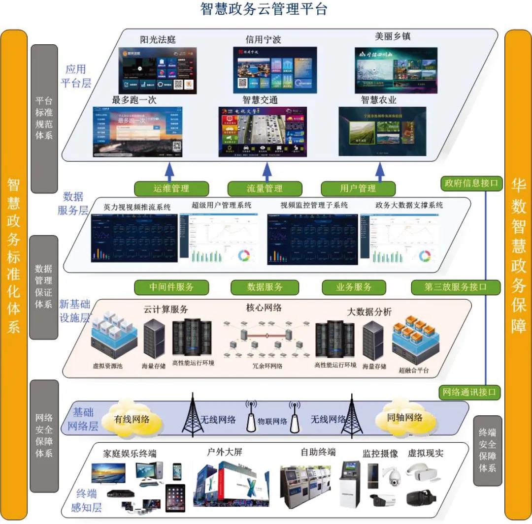 寧波智慧政務(wù)云平臺(tái)是由寧波華數(shù)自主研發(fā)的開(kāi)放式綜合服務(wù)云平臺(tái),平臺(tái)研發(fā)融合了一定的中臺(tái)服務(wù)思路,為后續(xù)的拓展提供廣闊的空間。具體的系統(tǒng)架構(gòu)圖如圖1所示,寧波智慧政務(wù)電視云管理平臺(tái)包括終端感知層、基礎(chǔ)網(wǎng)絡(luò)層、基礎(chǔ)設(shè)施層、數(shù)據(jù)服務(wù)層、應(yīng)用平臺(tái)層。層與層之間,采用標(biāo)準(zhǔn)的接口進(jìn)行相互通訊,從而形成智慧政務(wù)標(biāo)準(zhǔn)化技術(shù)架構(gòu)體系。