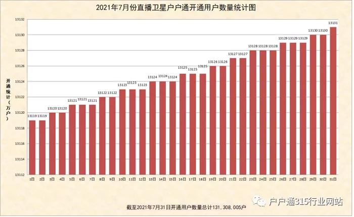 根據(jù)廣電總局發(fā)布的直播衛(wèi)星戶戶通開(kāi)通用戶數(shù)量統(tǒng)計(jì)圖計(jì)算,截止2021年7月31日全國(guó)戶戶通累計(jì)開(kāi)通用戶數(shù)量13131萬(wàn)戶(1億3131萬(wàn)戶),比上月底6月30日的13119新增12萬(wàn)戶,平均每天開(kāi)通0.39萬(wàn)戶,合每天開(kāi)通3900戶。比上個(gè)月的開(kāi)通數(shù)量速度略有增加。