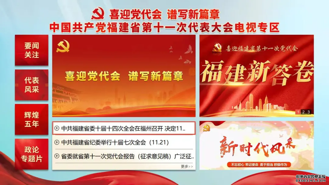 “中國共產(chǎn)黨福建省第十一次代表大會”電視專區(qū),全天24小時更新內(nèi)容,集納省主流媒體的權威新聞報道和專題節(jié)目,全面薈萃最新資訊,總結(jié)近年來經(jīng)濟社會發(fā)展和黨的建設等方面的成功實踐,生動呈現(xiàn)新時期的中國故事、福建故事。