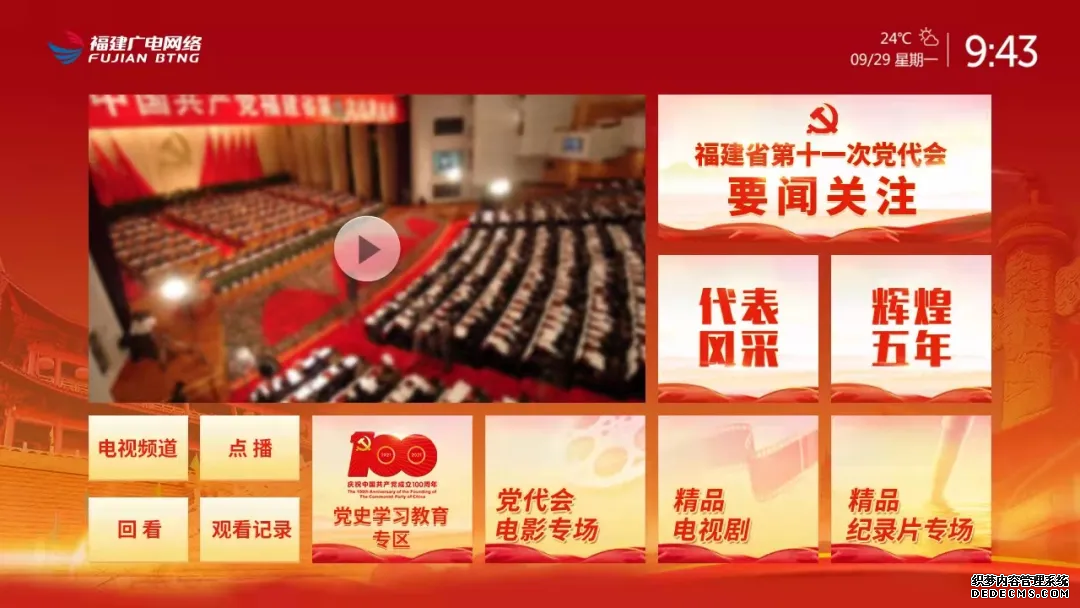 為給與會代表提供高質(zhì)量的電視視聽服務,福建廣電網(wǎng)絡集團在會務酒店開設黨代會定制版電視頁面,匯聚省級電視媒體播出的黨代會相關報道。同時,特別策劃了黨代會電影專場、精品紀錄片專場、精品電視劇專場欄目,重點推薦院線新片大片,整合上線有關歷史、人文、自然類的高品質(zhì)紀錄專題片和一批優(yōu)質(zhì)的電視劇劇目。
