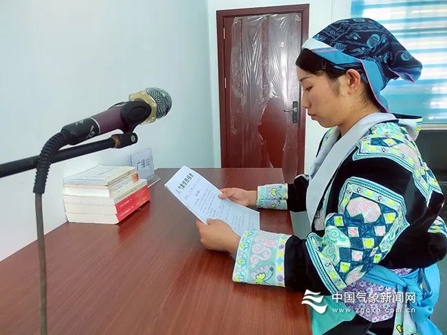2022年5月22日,貴州省福泉市仙橋鄉(xiāng)大花水村氣象信息員用苗族語言播報氣象信息。楊圊 攝影