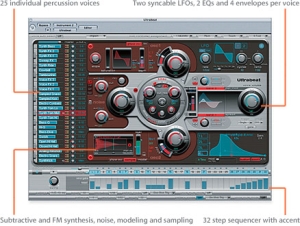 --新增的UltraBeat鼓機,集減法、FM、建模、采樣合成方法于一身,帶重音控制的32段步進音序器,最多24個pattern,最多25個聲部,每個聲部都有4個獨立的包絡(luò)發(fā)生器