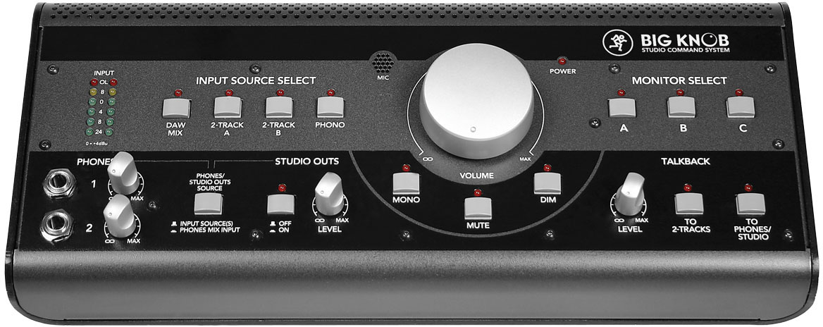 Mackie公司的錄音室指令控制器Big Knob,是一款及監(jiān)聽電平、控制監(jiān)聽、切換監(jiān)聽、聽源選擇、錄音室對講雙監(jiān)聽、耳機輸出唱機于一體的前置放大器。
