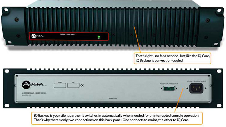 iQ用主機(jī) iQ Core調(diào)音臺(tái)引擎可提供4個(gè)話筒輸入、16個(gè)模擬輸入、8個(gè)模擬輸出、2個(gè)AES/EBU輸入/輸出,4路GPIO接口,帶6Livewire 100Base-T端口(其中4個(gè)有PoE) 和2個(gè)千兆網(wǎng)端口(RJ-45 & SFP)的以太網(wǎng)交換機(jī)。使用Axia 音頻節(jié)點(diǎn)可以輕松地?cái)U(kuò)展I/O。4CANBus 接頭最多支持24個(gè)推子,或者三張控制臺(tái)面,加上附件面板。自動(dòng)感應(yīng)電源供應(yīng)90VAC 到240VAC, 50Hz 到60Hz. 500瓦。機(jī)架安裝式,3RU