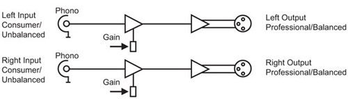 每組通道的左右輸出端均獨立設(shè)有增益控制,通過后背面板上的微調(diào)電位器設(shè)定。