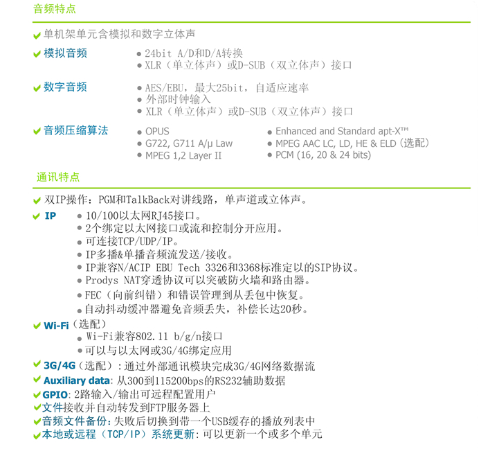 Quantum:從Prodys Ikusnet視頻解碼器家族繼承了世界一流IP技術(shù):自動抖動緩沖、自適應(yīng)比特率、綁定7個IP鏈路(以太網(wǎng)、3G/4G、Wi-Fi)保證最佳音頻質(zhì)量。