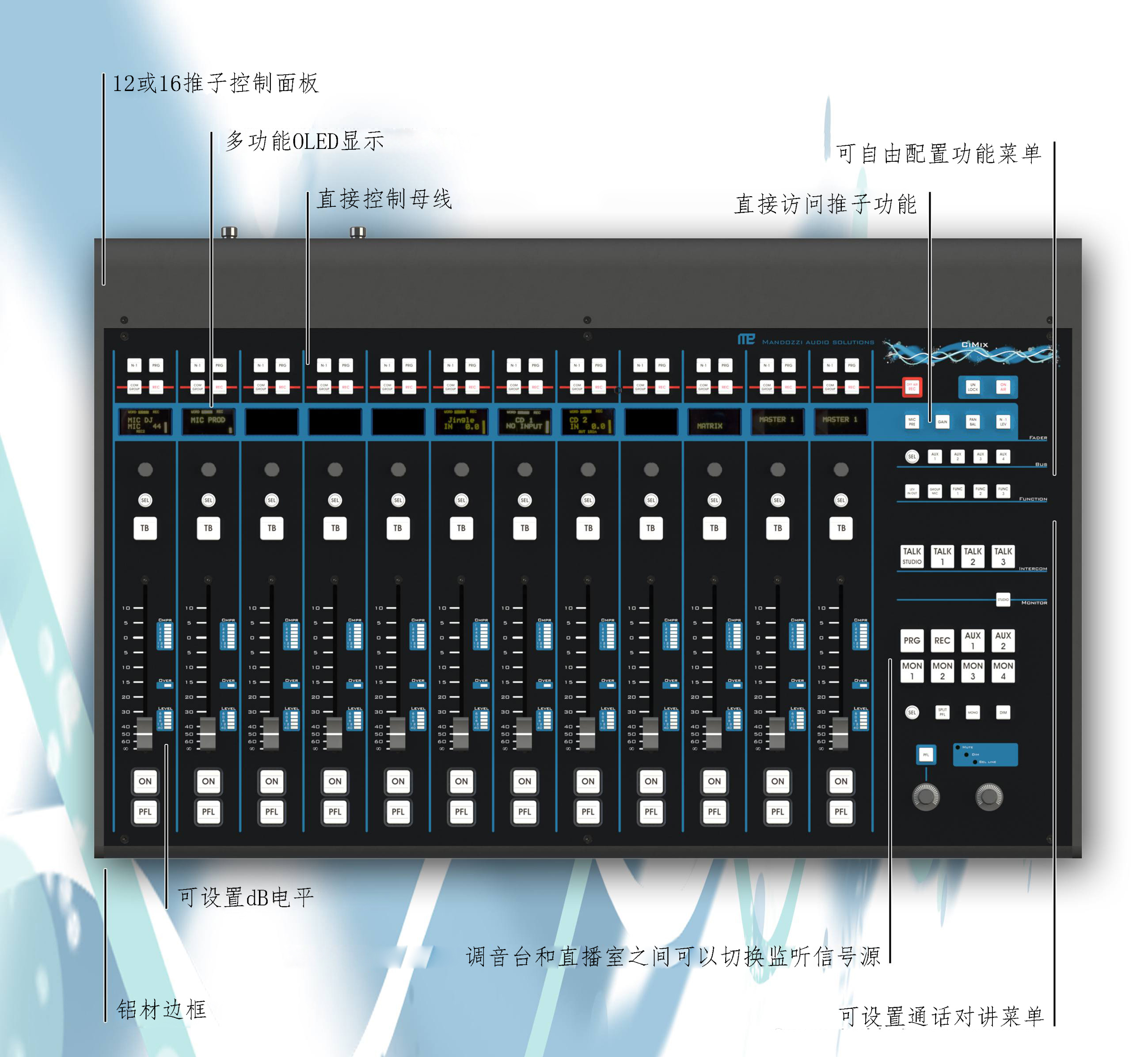 多功能且易于使用操作特點(diǎn)對于廣播電臺(tái)和技術(shù)人員理想選擇,它可以管理幾個(gè)互動(dòng)的直播室。CiMix可以連接到Mandozzi音頻矩陣便于組件一個(gè)網(wǎng)絡(luò)系統(tǒng)。