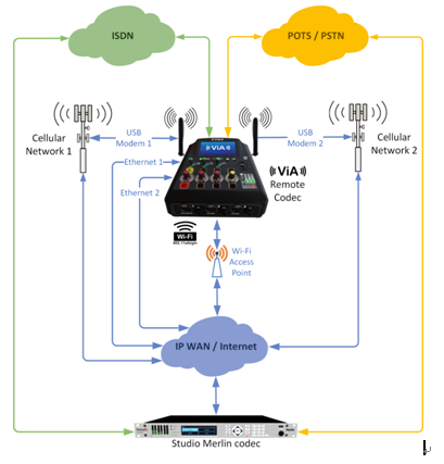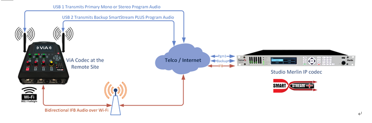 VIA 與Merlin或MerlinPLUS音頻編解碼器完美結(jié)合,可以傳輸高音質(zhì)的音頻——全雙工立體聲節(jié)目的音頻和一個(gè)獨(dú)立的雙向IFB通訊鏈路。舉個(gè)例子,你可以使用一個(gè)USB Modem傳輸播出節(jié)目;同時(shí),使用另一個(gè)USB Modem或者Wi-Fi傳輸您的IFB通訊。