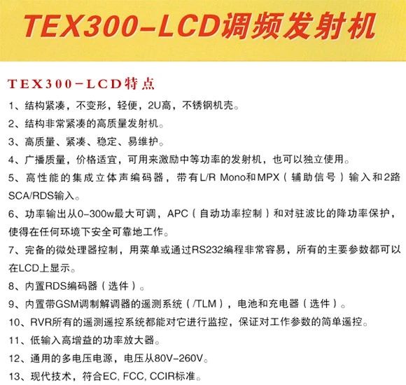 產品簡介:TEX300LCD 300W一體化調頻發(fā)射機