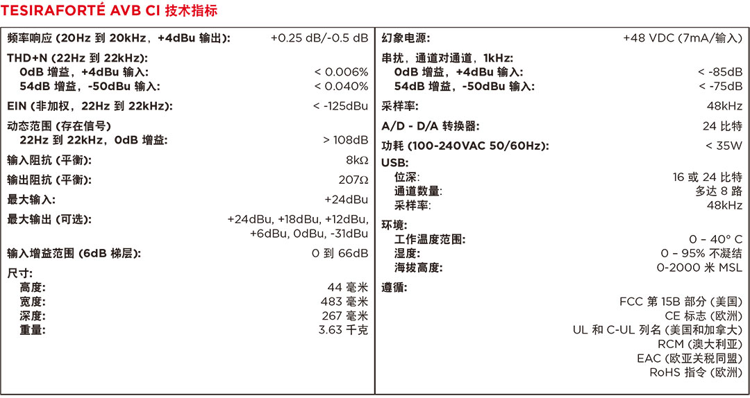 進(jìn)的會(huì)議解決方案。TesiraFORTéAVBCI使用音頻視頻橋接(AVB)數(shù)字音頻網(wǎng)絡(luò)、和可以用作獨(dú)立設(shè)備,或與其他TesiraFORTé設(shè)備、TesiraDSPs、擴(kuò)展器和控制器相結(jié)合使用。TesiraFORTéAVBCI還提供了廣泛的音頻處理,包括但不限于:信號(hào)路由和混音、均衡、濾波、動(dòng)態(tài)和延遲以及控制、監(jiān)控和診斷工具,均通過Tesira軟件配置。TesiraFORTéAVBCI是中小型房間的最佳選擇,這類房間需要使用語言擴(kuò)聲和分區(qū)擴(kuò)聲的高品質(zhì)音頻解決方案(如會(huì)議室或理事會(huì)會(huì)議廳)。
